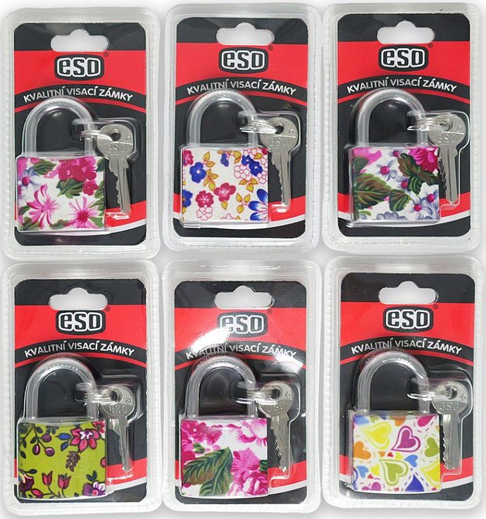 Zámek visací ESO s potiskem KYTKY 38 mmVelikost: 38 mm.Balení obsahuje 3 ks klíčů.Visací zámek je dodáván v blistru.K dostání jsou různé motivy (kytky, ornamenty, srdíčka).POŽADOVANÝ MOTIV NAPIŠTE DO POZNÁMKY K OBJEDNÁVCE.Ilustrační foto.