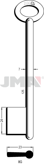 Klíč JMA 8GOznačení polotovaru klíče: 8G.Kategorie: nábytkové, trezorové a vratové klíče.ALTERNATIVNÍ ZNAČENÍERREBI: 50J8G